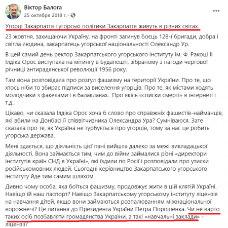 Це не одинична заява Віктора Балоги, направлена проти угорських політиків та громадських діячів Закарпаття.