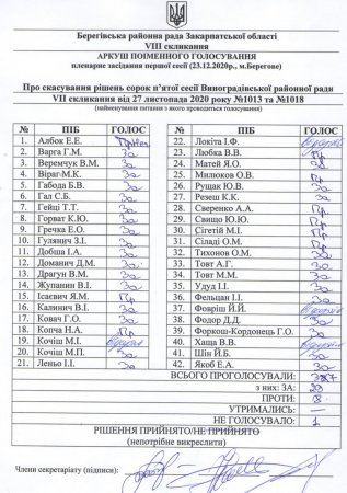 Рішення приймалось під бурні оплески присутніх у залі представників берегівщини та так-званих активістів з Виноградова а саме Сергія Волошина, депутатки Виноградівської ОТГ Еліси Сідей та її компаньона- депутата Миколи Лемка, які дивним чином відстоювали інтереси берегівщини а не Виноградівської ОТГ на вірність мешканців якої вони клятвенно присягали, тож їх поведінка- це зрада чи виконання чиїхось замовлень нам достеменно не відомо, але те що їх слова нічого не вартують це вже факт, напевно вони трохи плутають хто їх обирав і для чого. Голосування відбувалось як у кращі часи комунізму провладною більшістю одноголосно, однак слід зауважити що вирішальними тут були голоси депутатів яких обрали від Виноградівщини і які мешкають у Виноградові та прилеглих селах, а саме: