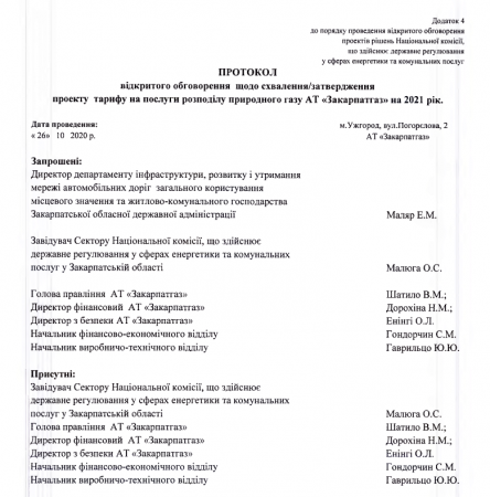 26 жовтня 2020 року АТ «Закарпатгаз», провів «відкрите» обговорення щодо схвалення/затвердження проекту тарифу на послуги розподілу природного газу на 2021 рік.