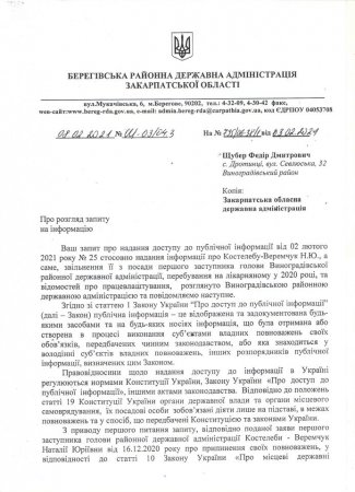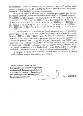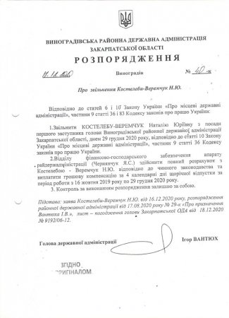 Розпорядженням голови Виноградівської РДА п.Вантюх І.В. днем 29 грудня 2020 року Велику НАТАЛІЮ,якою вона себе бачила звільняють із роботи,а саме із посади першого заступника голови Виноградівської РДА.