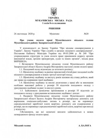 Справа стосується конфлікту інтересів міського голови, а сама подія, як стала приводом для розгляду, мала місце 26 листопада 2020-го – на першій сесії Мукачівської міськради 8-го скликання після місцевих виборів у жовтні того ж року. Тоді в урочистій обстановці під оплески депутатів новообраному меру вручили посвідчення міського голови, він склав присягу посадової особи місцевого самоврядування. Відтак міськрада таємним голосуванням обрала секретаря, затвердила заступників мера й перейшла до буденніших справ, у тому числі й до питання про зарплату й премію міського голови. І Балога, очевидно, перебуваючи в ейфорії від попередніх урочистостей, разом з іншими депутатами особисто проголосував за щомісячну надбавку собі "за високі досягнення в праці" у розмірі 50% окладу, щомісячну премію у 55% від окладу, а потім ще й за дві матеріальні допомоги – на вирішення соціально-побутових питань та на оздоровлення.