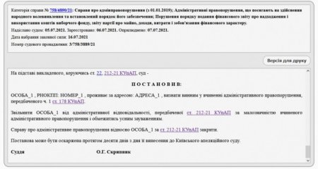 А тепер – найцікавіше. Через неуважність, бажання якимось чином насолити злісному порушнику, котрий регулярно умисно ухиляється від суду, чи ще через якісь причини, суддя Скрипник винесла щодо Балоги унікальну для судової практики України постанову. Якщо у вступній, описовій та мотивувальній частинах судового рішення йдеться про неподання фінансового звіту керівником партії "Команда Андрія Балоги" та доведеність його вини за ст.212-21 КУпАП, то в резолютивній частині (яка є основною) написано таке: