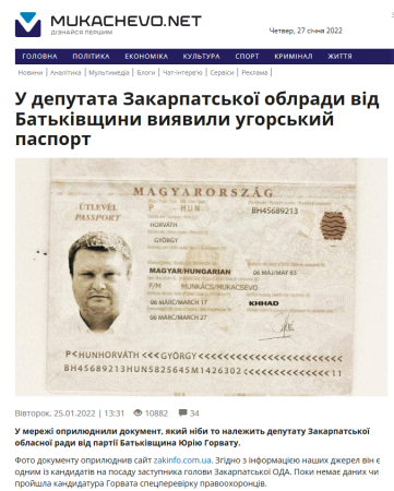Не встиг загаснути «скандал» з оприлюдненням угорського паспорту депутата обласної ради «За майбутнє» Василя Іванча, як пробалогівський сайт «Мукачево нет», публікує новий компромат з посиланням на мало відомий сайт про наявність паспорту в іншого депутата вже від «Батьківщини» Юрія Горвата. Більш як ймовірно не за горами буде публікація угорського паспорту ще однієї депутатки, а саме Єдіти Петеї.