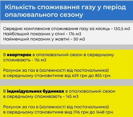 Ціни на газ залишатимуться тогорічними. Тобто, від 7,70 грн до 10 грн за кубометр. За місяць опалювального сезону мешканці квартир платитимуть 659−855 грн. У приватних будинках витрати на газ будуть більшими — 1116−1448 грн.