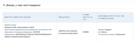 Голова Неліпинської сільської громади Мукачівського району Закарпатської області Василь Брудняк, задекларував заробітну плату отриману за основним місцем роботи у сумі 1 009 892 гривень. Фактично не всі бойові офіцери, які знаходяться на передовій фронту та ризикують своїм життям отримують такі заробітні плати.