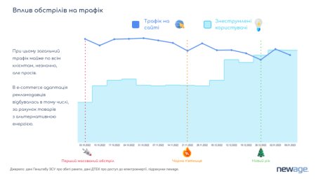Серед вагомих факторів впливу також можна згадати тимчасові знеструмлення (блекаути) та планове обмеження енергопостачання. Відсутність електроенергії не може не вплинути на онлайн-продажі. Але торішні дані свідчать, що трафік в найгіршому випадку падав до 15% навіть за великої кількості знеструмлених користувачів: