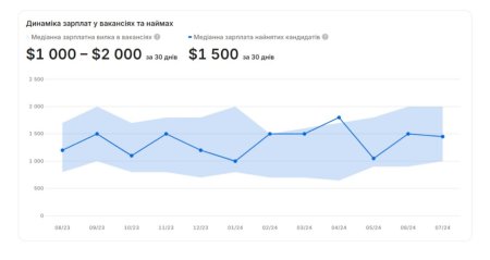 Сама по собі зарплата інтернет-маркетолога на момент працевлаштування недостатньо показова. Важливо також розуміти, як вона змінюється з часом чи під впливом інфляції. Наприклад, Djinni пропонує такий графік змін динаміки зарплат у вакансіях для категорії «Маркетинг» та регіону Україна: