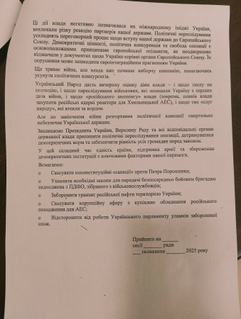 «Відбулася позачергова сесія Закарпатської обласної ради. Сесія про ЄДНІСТЬ! За командою згори ради всіх рівнів мають збиратися (принцип децентралізації в дії) і підтримувати преЗЕдента, бо його «ображає» Трамп і не хоче з ним говорити... Ну ок, фракція ЄС в облраді завжди виступає за єдність і готова підтримати звернення, якщо слуги преЗЕдента підтримають наше звернення – проти переслідування військових та опозиції, а також за зняття неконституційних санкцій із Порошенка, яке на погоджувальній раді підтримано представниками всіх фракцій.