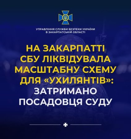 Минулого тижня у Виноградові Служба безпеки України затримала помічника суду, який, за даними слідства, допомагав ухилянтам від мобілізації. Чиновник організовував схеми з оформленням фіктивних розлучень та судових рішень про виховання дитини батьком-військовозобов’язаним, що дозволяло отримати відстрочку. Вартість таких "послуг" становила 6 тисяч доларів США. Затримання відбулося згідно зі ст. 208 КПК України, а помічнику суду оголошено про підозру за ч. 1 ст. 114-1 Кримінального кодексу України (перешкоджання законній діяльності Збройних Сил України та інших військових формувань).