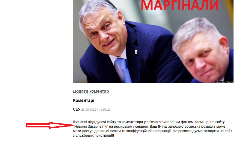 На першому скріншоті (файл "коментар.jpg") ми бачимо коментар від користувача "СБУ", датований 28.05.2025 о 19:56:59. Зміст коментаря попереджає відвідувачів сайту про виявлений факт розміщення "Новин Закарпаття" на російському сервері, зазначаючи, що їх IP-адреса знаходиться під загрозою російської розвідки, яка може отримати доступ до пошти та конфіденційної інформації. Коментар також не рекомендує заходити на сайт зі службових пристроїв.