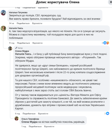 Куди більш різкий коментар щодо ситуації дала інша активістка — Наталія Гнесь, яка вважає цю інформаційну атаку політично вмотивованою та пов’язаною з проросійським реваншем на місцевому рівні. У своєму дописі вона припустила, що за публікацією можуть стояти російські політтехнологи, зокрема Артур Шерегі, якого пов’язують з роботою на уряд РФ навіть після 2022 року.
