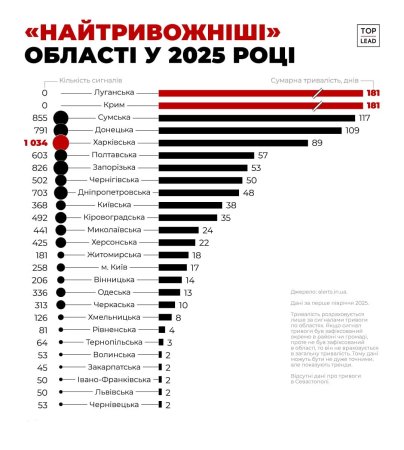 Цей показник значно відрізняється від ситуації в інших регіонах України. Для порівняння, Луганська та Кримська області лідирують за сумарною тривалістю тривог (181 день), а Харківська область має найбільшу кількість сигналів (1034).