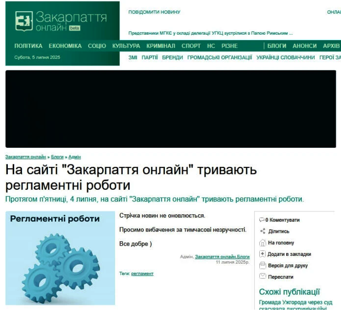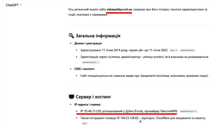 Незалежний технічний аналіз підтвердив, що сайт «Закарпаття онлайн» певний час розміщувався на російських серверах. Попри публічні спростування з боку власників, факт наявності IP-адреси з Дубни (РФ) залишається задокументованим.
