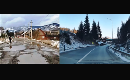 Уявіть: з одного боку — калюжі по коліно, розбиті асфальт і старі дерев’яні хати, з іншого — ідеальна траса, що веде до сучасного курорту. Два фото, зроблені майже в один день, показують, що могло бути і що є.