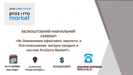 16 – 17 червня 2021 року замовників та постачальників Закарпаття запрошують прийняти участь в навчальному семінарі «Як Замовникам ефективно закупити, а Постачальникам вигідно продати в системі ProZorro Market?».