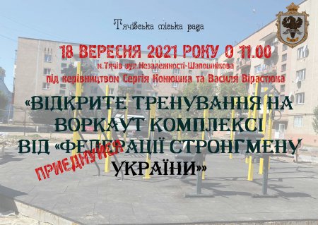 В рамках святкування Дня міста Тячів 18 вересня 2021 року о 11:00 год. на новому майданчику для воркаута у дворі багатоповерхівок вулиці Незалежності-Шапошнікова під керівництвом Сергія Конюшка та Василя Вірастюка проводитиметься відкрите тренування на воркаут комплексі від «Федерації стронгмену України».