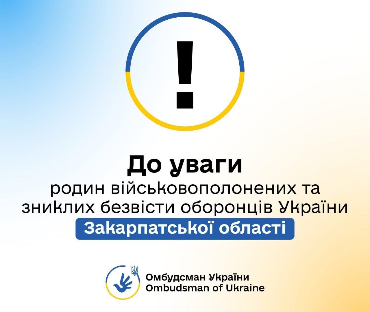 ❗️Увага! Анонс зустрічі Омбудсмана України Дмитра Лубінця з родинами військовополонених та зниклих безвісти Захисників і Захисниць України на Закарпатті.