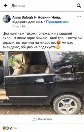 Анна Балог в одній із місцевих спільнот міста Чоп, повідомила про крадіжку з автомобіля.