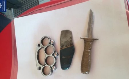 Прибувши на місце правоохоронці побачили чоловіка з холодною зброєю у руках. При його поверхневому огляді у лівій кишені куртки знайшли кастет.