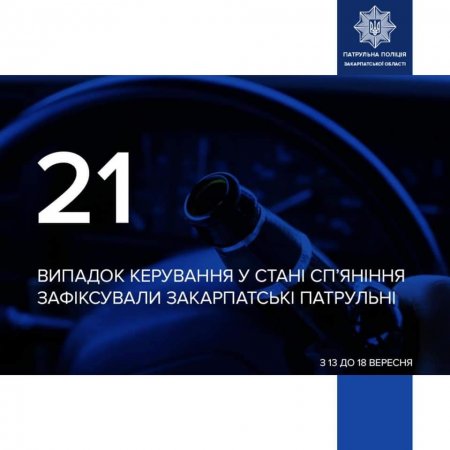З 13 до 18 вересня закарпатські патрульні зафіксували 21 випадок керування у стані сп'яніння