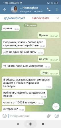 Наша громадська організація «Карпатська Січ», яка представляє національно-патріотичний рух України, викрила спробу вчинення провокації з російської сторони щодо угорської національної меншини Закарпаття.На представника нашої організації через месенджер «Телеграм» вийшов користувач із території РФ під ніком @vienersehuf1983pi з пропозицією в період різдвяних свят вчинити акт вандалізму щодо офісу «КМКС – партії угорців України» (м. Ужгород, Православна набережна, 5) у формі розбиття вікон та здійснення написів на будівлі: «Мадяри – паразити і зрадники! Геть з України! Хто не втече, той перший! Мадярів на ножі!». За наявності на будівлі угорського прапору замовник також наказав його спалити. При цьому для підтвердження виконання завдання необхідно було все зафіксувати на відеокамеру, а запис надіслати в месенджер або на ресурс turbo.me. За фактом виконаної роботи та її перевірки замовником обіцяна оплата в розмірі 1000$.Росіянин був у спільноті «Безпечне місто Ужгород» (https://t.me/bezpechnemistouzh) і саме через неї вийшов на зв’язок. Тому є вірогідність, що він писав також іншим ужгородцям.Аналізуючи ситуацію, ми повинні відповісти на питання: кому це вигідно? В України зараз один явний ворог, якому дуже не на руку, щоб у нашої держави були нормальні стосунки з європейськими сусідами – Росія. Бачимо вже не вперше, як ситуація штучно підігрівається російськими спецслужбами. Ми звернулись до органів Національної поліції та Служби безпеки України для вжиття спільних заходів з викриття і документування вказаної протиправної діяльності та недопущення дестабілізації суспільно-політичної ситуації в Закарпатті на міжетнічному підґрунті (різдвяні свята західного обряду пройшли в нашому регіоні без порушень та провокацій).За нашими даними, в рамках кримінального провадження за ознаками ст. 161 КК України (порушення рівноправності громадян залежно від їх національної належності) правоохоронцями проводяться невідкладні процесуальні дії, спрямовані на встановлення замовників вказаної провокації та недопущення протиправних дій щодо нацменшин. Нам відома особа, яка вийшла на контакт – це співробітник ФСБ, який перебуває у Москві. Всі прояви шовінізму на Закарпатті протягом останніх кількох років об’єднує одне: їх причиною є робота російських спецслужб та вербовка безпринципних українців. Звертаємось до усіх громадських організацій національно-патріотичного спрямування в інших регіонах нашої Батьківщини, що подібні підходи з боку представників країни-агресора можуть бути і до Вас та у ваших регіонах! Будьте пильними, сигналізуйте нам та не піддавайтесь на провокації!Ми й надалі стоїмо на сторожі територіальної цілісності України, забезпечення міжнаціональної злагоди в Закарпатті. І обов’язково будемо вживати всіх заходів задля недопущення провокацій у нашому краї.
