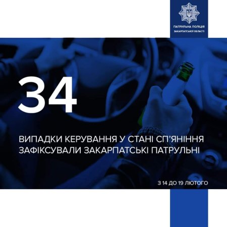 Протягом цього тижня, з 14 до 19 лютого, закарпатські патрульні зафіксували 34 випадки керування у стані наркотичного або алкогольного сп‘яніння.