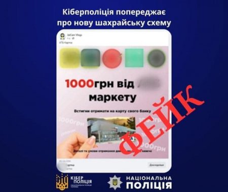 Зловмисники через соцмережі розповсюджують фейкові повідомлення про можливість отримати 1000 гривень на банківську картку від імені популярної мережі супермаркетів. Мета шахраїв – збір платіжних даних користувачів з метою привласнення їхніх заощаджень.