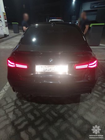 Миттєво прибувши на місце події, поліцейські виявили автомобіль BMW із заклеїними номерними знаками та з онаками підробки. Водій з місця події втік.
