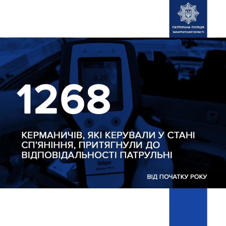 Від початку 2024-го року патрульні поліцейські Закарпатської області притягнули до відповідальності за нетверезе керування 1️⃣2️⃣6️⃣8️⃣ водіїв