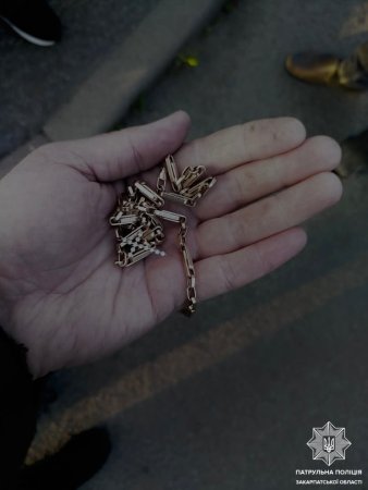 Жінка, яка перебувала поруч, у розпачі звернулась до патрульних: щойно невідомий зірвав із неї золотий ланцюжок і намагався втекти з місця злочину.