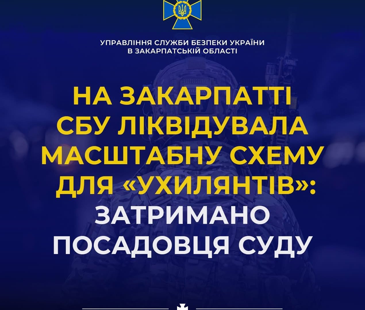 Служба безпеки України блокувала нову масштабну схему ухилення від мобілізації на Закарпатті. За результатами комплексних заходів затримано організатора оборудки — помічника судді одного з районних судів.