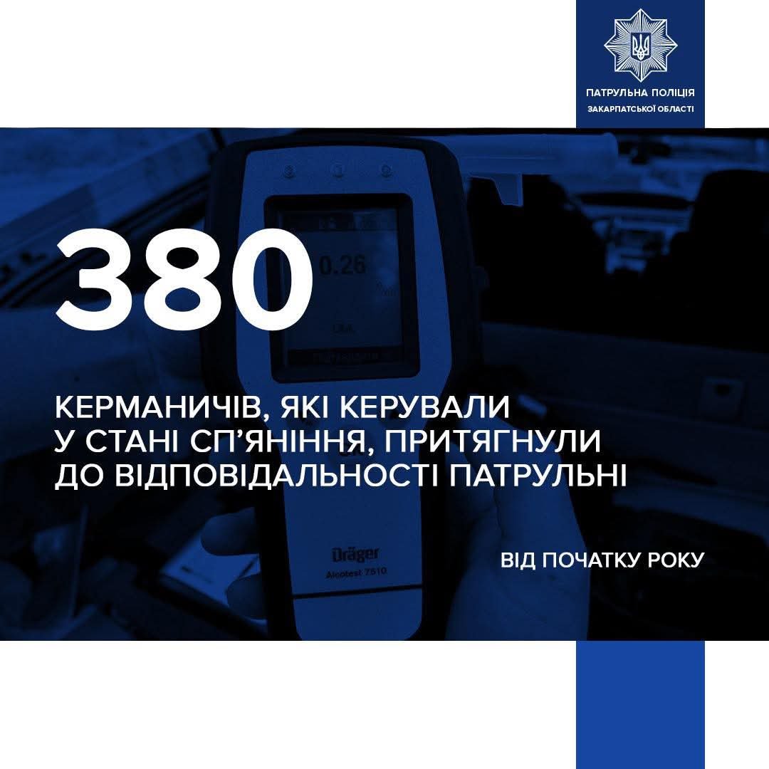 З початку поточного року патрульні поліцейські Закарпатської області виявили та притягнули до відповідальності 380 водіїв за керування транспортними засобами у стані сп'яніння. Ця статистика свідчить про системну роботу правоохоронців, спрямовану на підвищення безпеки дорожнього руху та запобігання аваріям, спричиненим нетверезими водіями.