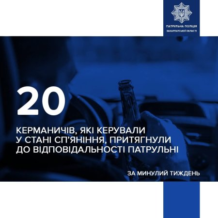 Минулого тижня поліція притягнула до відповідальності 20 водіїв за керування транспортними засобами у стані алкогольного або наркотичного сп'яніння. Це є серйозним порушенням, що несе загрозу для життя та здоров'я всіх учасників дорожнього руху.