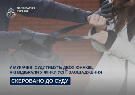 Ювенальна прокуратура Закарпатської обласної прокуратури затвердила обвинувачення проти двох спільників, мешканців Мукачева. Їм інкриміновано грабіж, вчинений за попередньою змовою групою осіб в умовах воєнного стану (ч. 4 ст. 186 КК України).
