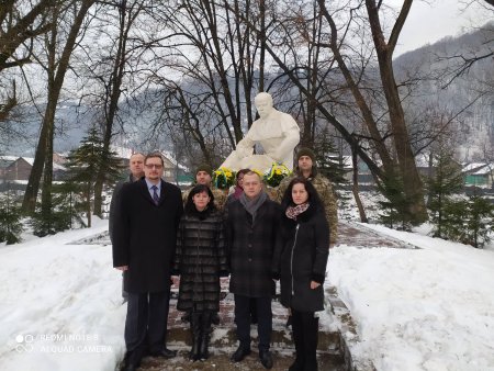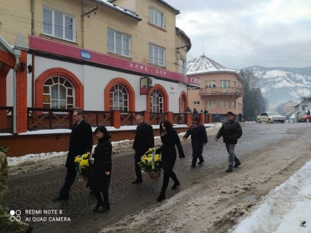 У церемонії урочистого покладання квітів взяли участь в.о. голови районної державної адміністрації Віктор Турок, голова районної ради Діана Бабинець, голова Рахівської територіальної громади Віктор Медвідь та керівники структурних підрозділів райадміністрації.