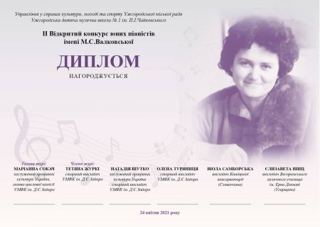 Довідково. Маріанна Степанівна Валковська – музикант-педагог, створила на Закарпатті фундаментальну фортепіанну школу. У 1955 році Маріанна Валковська розпочала свій педагогічний шлях у колективі Ужгородської музичної школи. За роки роботи в музичному училищі вона підготувала сотні музикантів-професіоналів, серед яких і народні артисти України – Й.Ермінь, Е.Чуприк, заслужена артистка України Н.Висіч, ціла плеяда яскравих педагогів та концертмейстерів, які працюють сьогодні в музичних закладах не тільки нашої області, а і всього світу.