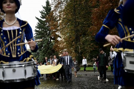 Опісля голова облдержадміністрації Анатолій Полосков разом із закарпатцями, гостями сьогоднішнього дійства пройшли святковою ходою зі 100-метровим прапором до найбільшого стягу області на пл. Б. Хмельницького.