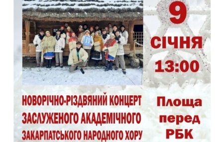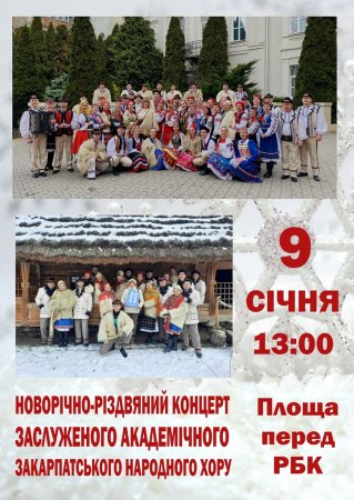 Шановні жителі та гості Рахівської територіальної громади! Щиро запрошуємо вас на НОВОРІЧНО-РІЗДВЯНИЙ КОНЦЕРТ ЗАСЛУЖЕНОГО АКАДЕМІЧНОГО «ЗАКАРПАТСЬКОГО НАРОДНОГО ХОРУ» ЗАКАРПАТСЬКОЇ ОБЛАСНОЇ РАДИ. Свято відбудеться 9 січня о 13:00 год. на площі перед Рахівським будинком культури.