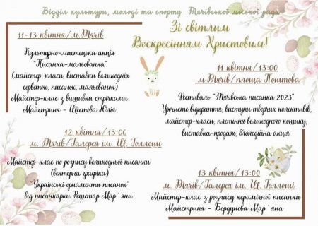 11 квітня о 13:00 год на Поштовій площі м.Тячів відбудеться фестиваль «Тячівська писанка 2023», організований Відділом культури, молоді та спорту разом з МФОЗНС Регіон Карпат NEEKA.