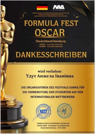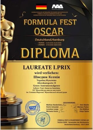 На Міжнародному двотуровому конкурсі мистецтв «FORMULA FEST OSCAR, що проходив у Німеччині талановита учениця фортепіанного відділу Мукачівської школи мистецтв ім.С.Мартона виборола I місце.