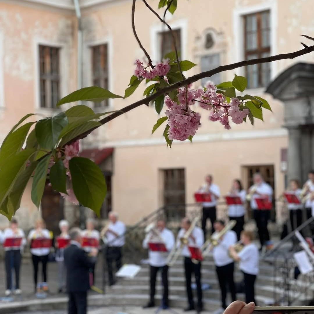 ✅Вчора до Мукачева з концертною програмою просто неба «Звуки Надії» завітав оркестр тромбонів з Баварії під керуванням Ганса Йоакима Шольца. Мукачівці, які зібралися у дворі художньої школи, мали гарну нагоду почути музичні твори в інтерпретації оркестру, учасниками якого є представники з сімнадцяти міст Баварії.