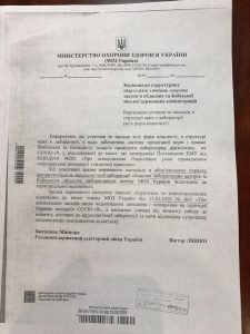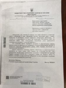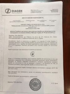 Згідно декларації про відповідність медичного виробу для діагностики in vitro „ Набір реагентів для виявлення РНК вірусу 2019 –nCOVметодом ПЛР у режимі реального часу» вимогам Технічного регламенту щодо медичних виробів для діагностики in vitro (затвердженого постановою Кабінету Міністрів України № 745 від 02.10.2013 р.) відповідає. Виріб супроводжує знак відповідності технічним вимогам. Згідно декларації про відповідність та технічного регламенту щодо медичних виробів для діагностики інвітро для зазначеного маркування було забезпечено проведення процедури оцінки відповідності, яке відповідає вимогам держстандарту. Згідно листа Міністерства охорони здоров’я установи , у структурі яких є лабораторії , в яких забезпечено систему організації норм і правидбіолбезпеки та біозахисту можуть проводити лабораторну діагностику на COVІD- 19 , у відповідності до вимог , затверджених Постановою Кабміну. Усі позитивні зразки повинні доставлятися до вірусологічнох лабораторії обласних центрів МОЗ України відповідно до територіальної належності.