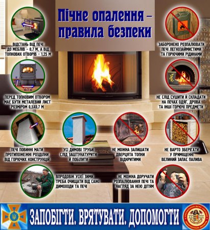 Чимала кількість від усіх зареєстрованих пожеж стається й через несправне пічне опалення. Тож треба завчасно підготувати й пічне опалення до зими. А для того аби перевірити, чи справний димар, не потрібно багато знань – білите його та протоплюєте піч. Це дасть змогу проглянути, чи є на ньому тріщини. Якщо є, муруєте. Далі подбайте про пластину з негорючого матеріалу перед топковим отвором грубки, а також не залишайте навіть дерев'яних, не те що інших легкозаймистих матеріалів і рідин поблизу неї.