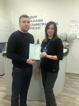 На фото керівник ЦНАП Івасюк Діана вручає новоспеченому батьку свідоцтво про народження дитини