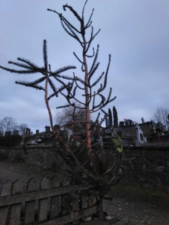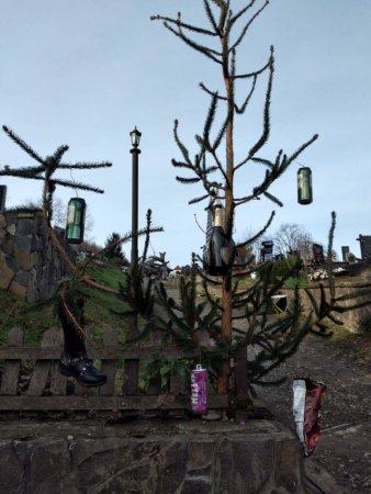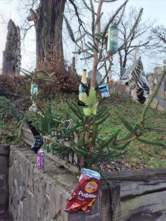 – Частину відрізаного зайвого стовбура та гілки вирішив не викидати. Думаю собі: якщо празник, то най буде празник для всіх. Най буде файно. Ці люди, які уже спочивають вічним сном, були живими, святкували Новий рік і Різдво. Задіяв свою фантазію. Гілки повтикав в огорожу, біля майданчика з контейнерами для ТПВ прикріпив стовбур ялинки. На нього почепив пляшку з-під шампанського, банки з-під пива, обгортки з солодощів, целофанові пакети, квіти з цвинтарних вінків, і навіть чобіт. Получилося файно і цікаво. Одним словом, ялинковими прикрасами стали речі, які знайшов у мусорці.