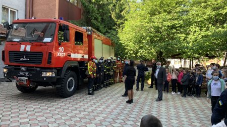 Після навчальної тривоги, педагоги та вихованці зібралися на подвір'ї закладу, де на них вже чекали хустські вогнеборці. Рятувальники розповіли, як вони реагують на сигнал тривоги та як від їх швидких і злагоджених дій залежить життя людей.