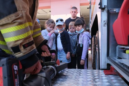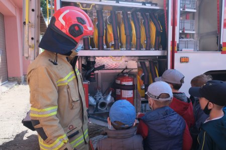 Рятувальники ознайомили допитливих гостей із "начинням" пожежного автомобіля та дали спробувати власноруч подати воду з пожежного ствола. Першокласники роздивлялися та уважно слухали про пожежні рукави, стволи та розгалуження. Розповіли вогнеборці й про апарати на стисненому повітрі, які використовують у непридатному для диханні середовищі.