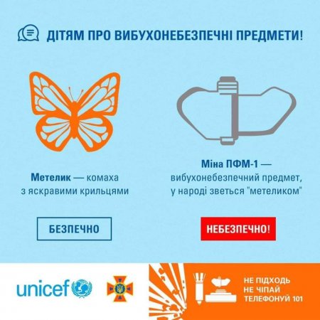 🦋Вислухайте дитину, поділіться своїми варіантами та скажіть, що хоч нам це нагадує красивого метелика, це дуже небезпечна міна. Вона невелика, розміром як долоня, може бути зеленою або коричневою. Ця міна може вибухнути, якщо до неї хтось доторкнеться, або навіть сама по собі — раптово. Тому наближатись до такого поганого "метелика" дуже небезпечно. Ця міна може сховатись у траві, біля кущів чи під будинком у тих містах, де була війна.