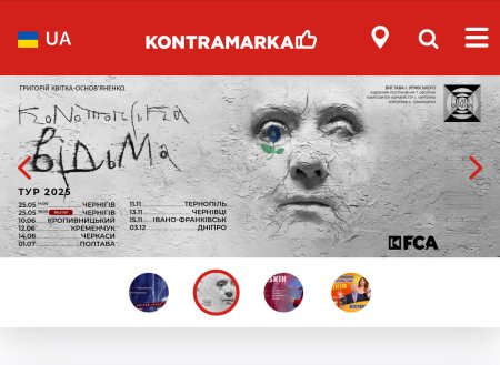 Сервіс Kontramarka стане ідеальним місцем для вибору та купівлі потрібних квитків. На вибір запропоновані локації чи самі події, після чого залишається лише вказати дату та вибрати місця з подальшим бронюванням квитків. Електронний квиток буде доступний в особистому кабінеті та додатково буде дубльований на електронну пошту.