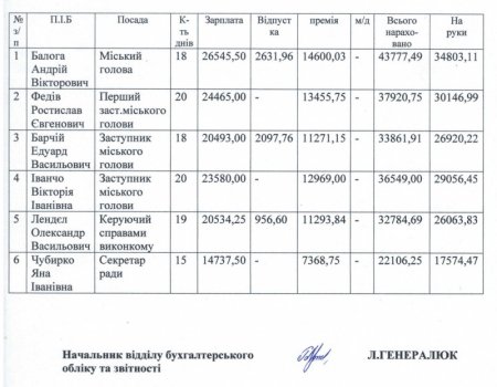 Балога Андрій Вікторович (міський голова) – за 18 днів йому нараховано 43777,49 грн (включаючи зарплату – 26545,50 грн, відпустку – 2631,96 грн та премію – 14600,03 грн). На руки міський голова отримав 34803,11 грн.